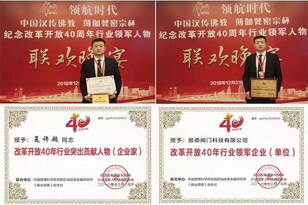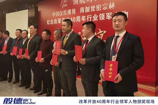 般德閥門科技有限公司董事長夏許超先生獲“改革開放40年行業突出貢獻企業家”榮譽稱號,般德閥門科技有限公司獲“改革開放40年行業領軍企業”榮譽稱號。